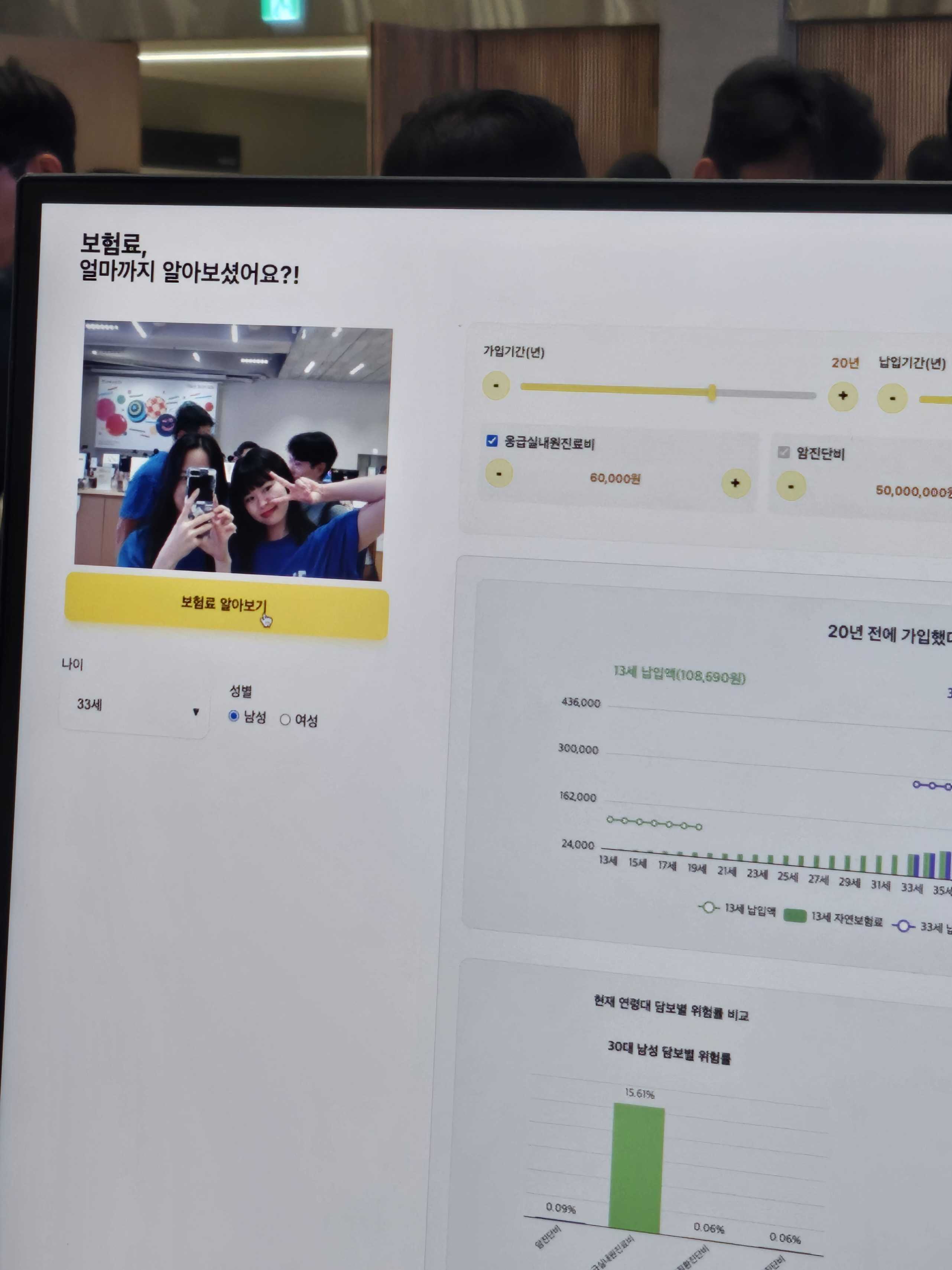 왼쪽 모니터에는 보험료에 대한 이론 설명 위주로 하고, 오른쪽 모니터에는 얼굴 인식을 통해 인식된 데이터를 가지고 보험료를 계산해주는 체험 위주로 컨텐츠를 꾸렸다.