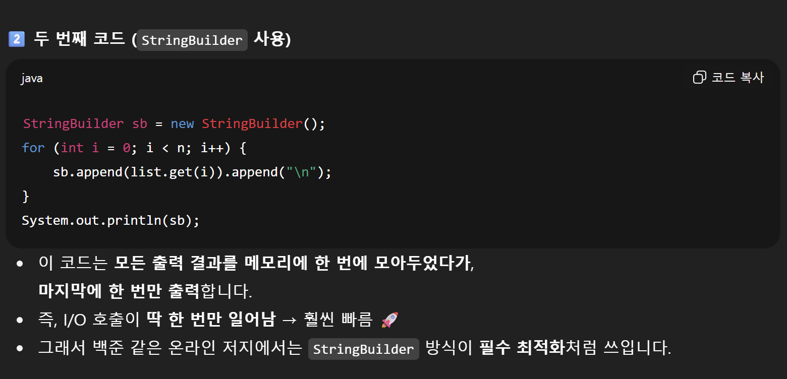 - StringBuilder로 한 번에 출력하면 훨씬 빠르다는 얘기를 어디서 들음